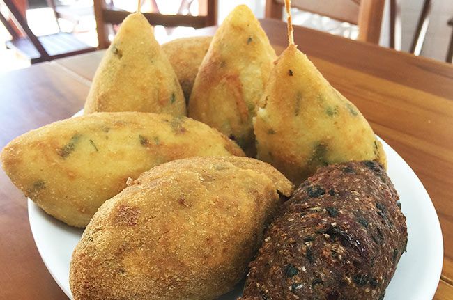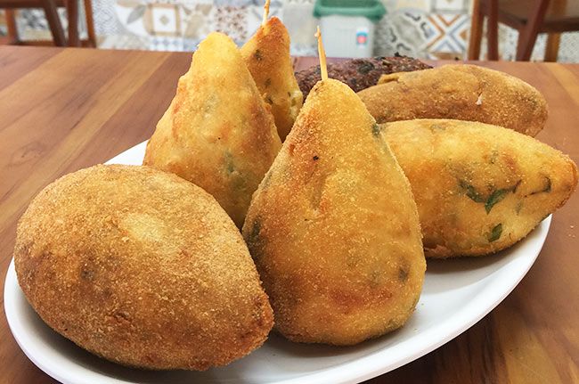 Coxinha com massa de mandioca (frango, carne, mortadela com queijo e palmito);